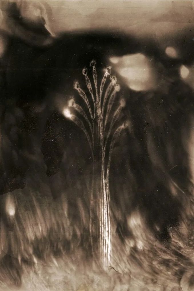Dal fondo scuro emergono linee e puntini luminosi, raggruppati a formare fiori, foglie, steli.