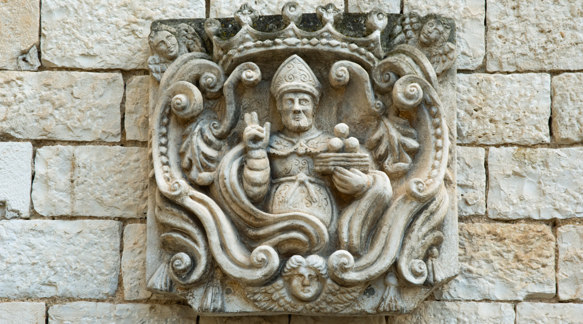 Scultura in pietra sulla facciata della Basilica del Santo a Bari