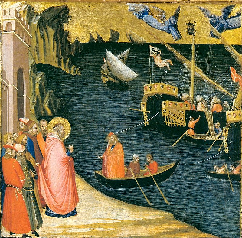 Il vescovo Nicola si reca al porto per chiedere ai marinai delle navi che stanno trasportando il grano ad Alessandria d'Egitto di darne una parte alla città di Myra, afflitta dalla carestia. I marinai eseguono l'ordine di Nicola e miracolosamente le navi si riempiono nuovamente di grano, così che, giunti a destinazione, i marinai non troveranno nessun ammanco nel carico.