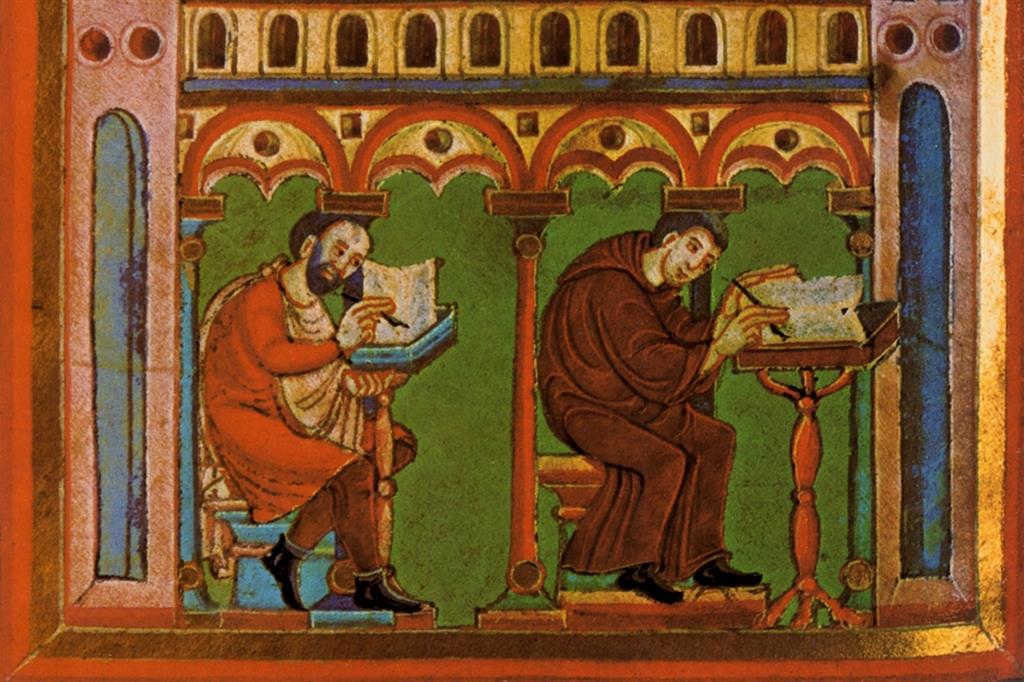 Gisulfo [...] All'improvviso prese una decisione e come sua abitudine non frappose indugio alla sua attuazione. Così, nel bel mezzo della notte, saltò in sella al suo cavallo e si diresse al galoppo verso la villa di Placidia. Non lontano da essa, nei mesi che seguirono, sulla cima di un colle fece erigere di furia un monastero cui cedette tutti i suoi beni ed in esso fece costruire due stupendi ed ampi locali, uno per ospitare la biblioteca, l'altro da usare come scriptorium. Passò il resto della vita in pace con sé e con gli altri, cantando con i confratelli e copiando manoscritti. Così facendo riteneva di far piacere a Placidia.
