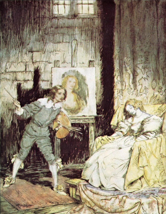 «Era una fanciulla di rara bellezza, e quanto amabile tanto giuliva. Maledetta fu l'ora in cui conobbe il pittore, e s'innamorò di lui e lo sposò. Lui, un uomo appassionato, studioso, austero, aveva già una sposa nella sua arte. Lei era una fanciulla di rara bellezza, e quanto amabile tanto giuliva; era fatta di luce e di sorriso, ed era festosa come un piccolo cerbiatto; tutto amava, tutto aveva caro; non odiava che l'arte, sua rivale; non temeva che la tavolozza e i pennelli e gli altri arnesi del dipingere che la privavano della presenza del suo amato. Fu terribile quando sentì il pittore esprimere il desiderio di fare il ritratto anche a lei. Ma era umile e obbediente e per settimane e settimane docilmente sedette nell'alta camera tetra della torre, dove la luce cadeva sulla pallida tela, penetrando dal soffitto. Lui, il pittore, trovava gloria nel suo lavoro, che di ora in ora progrediva sempre più. Ed era un uomo appassionato e strano, d'animo trasognato, che si perdeva in fantasticherie; tanto che non sapeva vedere come la luce che cadeva così lugubre dentro quella torre solitaria consumava la salute e le forze spirituali della sua sposa, che tutti vedevano languire, tranne lui. Eppure essa sorrideva e continuava a sorridere, senza mai lamentarsi, siccome vedeva che il pittore, il quale aveva già grande fama, s'infervorava con entusiasmo alla sua opera, e lavorava giorno e notte per dipinger colei che lo amava tanto ma che ogni giorno più deperiva ed intristiva. E in verità, chi contemplava quel ritratto parlava a bassa voce della sua rassomiglianza come d'una possente meraviglia che provava, oltre la forza, l'amore profondo del pittore per colei ch'egli raffigurava in modo così prodigioso. Ma a lungo andare, come l'opera si avvicinava al suo adempimento, nessuno fu più ammesso nella torre; perché il pittore era tutto preso dalla foga del lavoro, e non distoglieva che di rado gli occhi dalla tela, anche per osservare il viso della sua donna. E non vedeva come i colori che riversava sulla tela venivano tolti dalle gote di colei che gli sedeva dinanzi. E quando settimane e settimane furono passate, e più non restava quasi nulla da fare, null'altro che dare un tocco di pennello alle labbra ed uno agli occhi, lo spirito della giovine donna palpitò ancora come una fiamma al bocciolo della lampada. Allora il tocco fu dato, alle labbra e agli occhi; e il pittore rimase per un attimo in estasi dinanzi all'opera ch'egli aveva compiuto; ma continuando a contemplarla, subito tremò e si fece pallido e, atterrito, scoppiando in un urlo: "Ma questa è la vita, che ho creato!" si volse a guardare la sua beneamata, la quale era morta!".»
