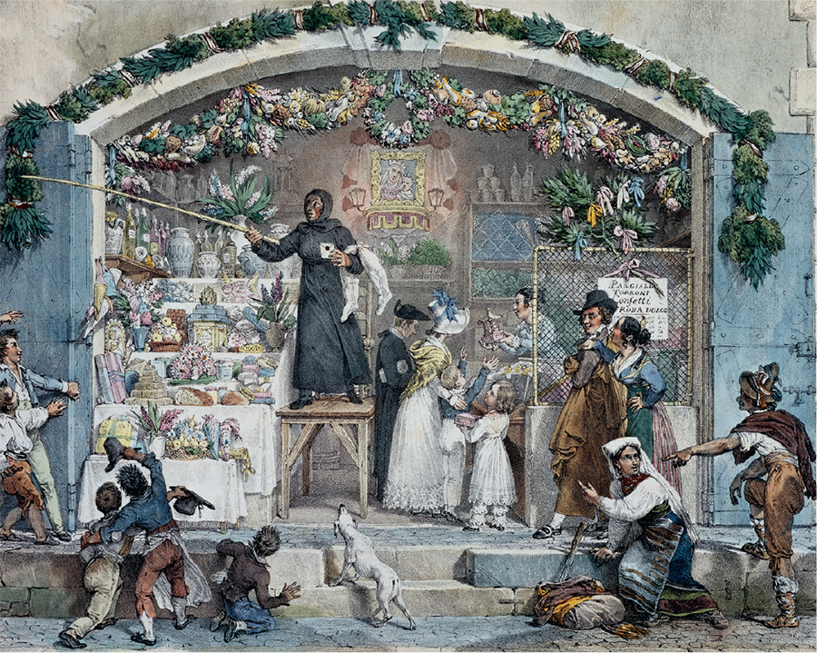 La Befana intrattiene una folla di bambini in una piazza romana (litografia di Antoine - Jean - Baptiste Thomas, ca. 1823).