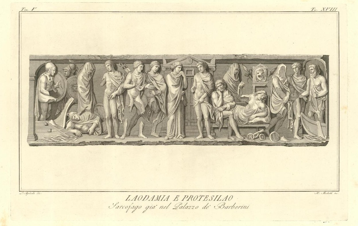 Protesilao fu il primo guerriero a metter piede sul territorio troiano ed il primo a trovarvi la morte, adempiendo così la profezia di un oracolo. La giovane sposa Laodamia, dopo una sola notte d'amore, aveva perduto il suo amato e non sapeva darsi pace. Secondo una versione del mito ebbe dagli dei la possibilità di riabbracciare il marito, al cui fantasma fu concesso un breve ritorno, seguito poi dalla discesa nell'Ade di entrambi.