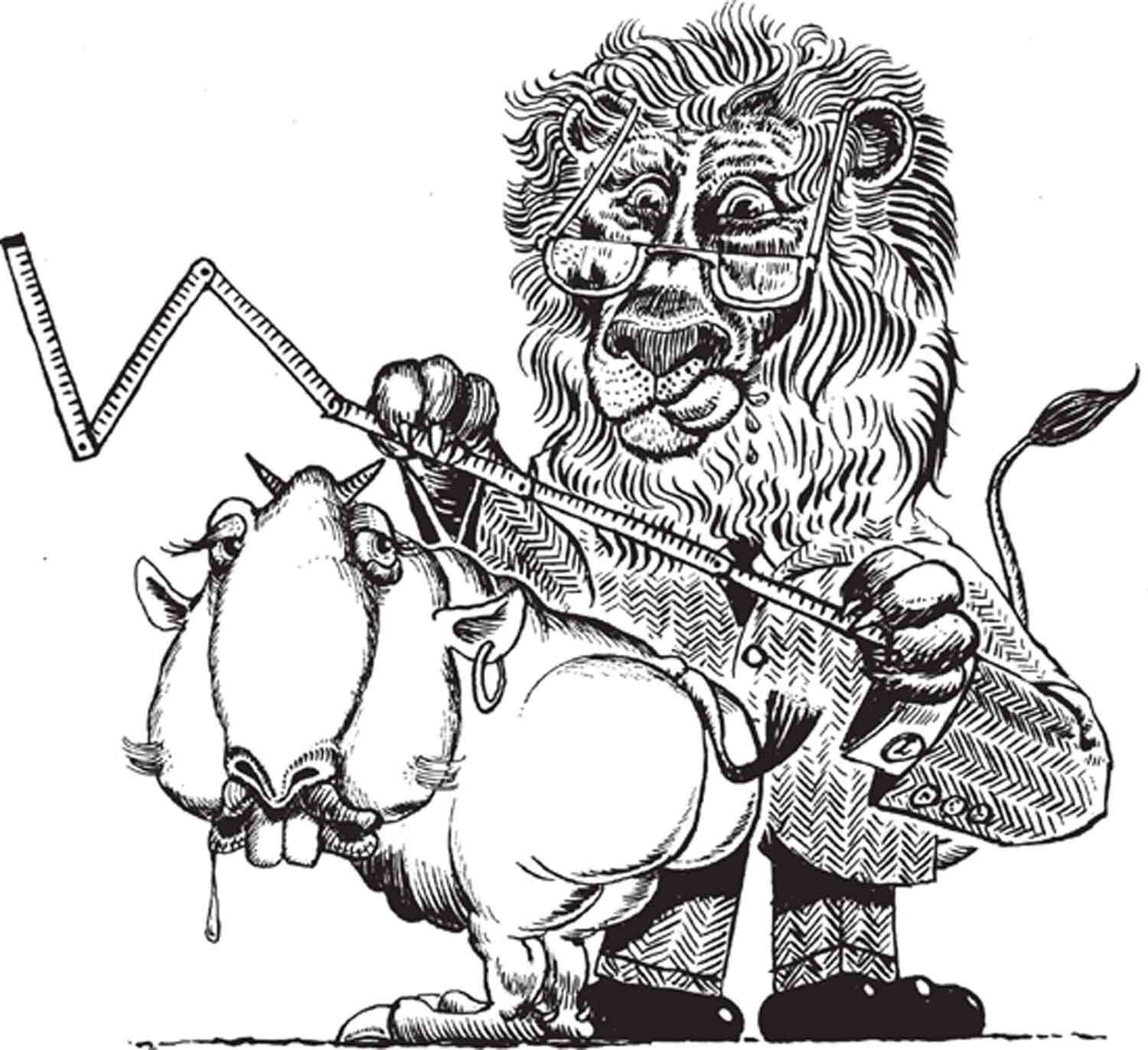 IL LEOMETRA Nome scientifico: Felis leopoldo. Animale che porta, anche d'estate, giacca, pantaloni e cravatta. Lupus ritiene che possa essere nato dall'incrocio tra un leone e un geometra. È un feroce predatore e attacca tutti gli altri animali, non per mangiarli, bensì per misurarli.