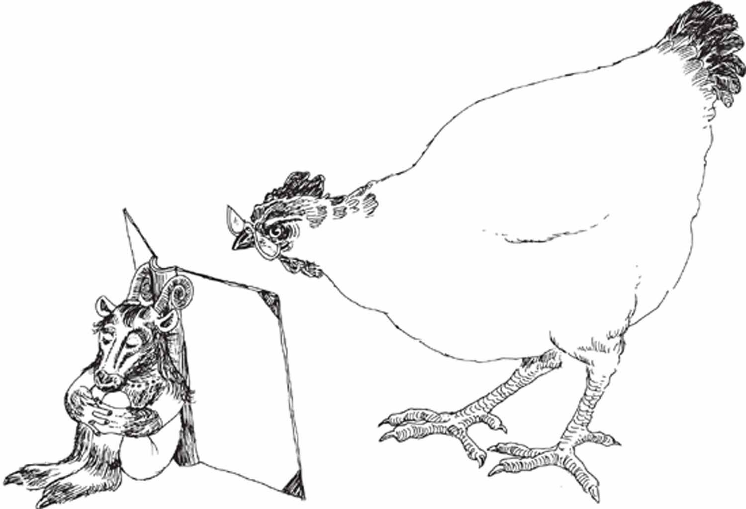 "Noi non sappiamo, signore, perché lei ossessivamente ribadisca questo suo trisillabo ossìtono, ma se con esso lei vuole stabilire una qualsivoglia primitiva forma di comunicazione col nostro ecosistema sappia che, pur essendo noi grandemente interessate allo studio dei nuclei linguistici aborigeni, abbisogniamo altresì nelle nostre conversazioni di una complessità di sintassi e di una flessibilità terminologica ben superiore a quella da lei attualmente esibita." Lupus chiese scusa, si presentò, e da allora in poi si recò spesso dalle galline a prendere il tè di granturco e a disquisire su argomenti filosofici, antropologici e gallinologici.