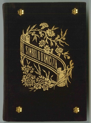 Il Non ti scordar di me si presenta con una veste elegante e pretenziosa: lussuosamente rilegato in velluto rosso con impressioni in oro, arricchito da illustrazioni, fregi e capilettera policromi.
